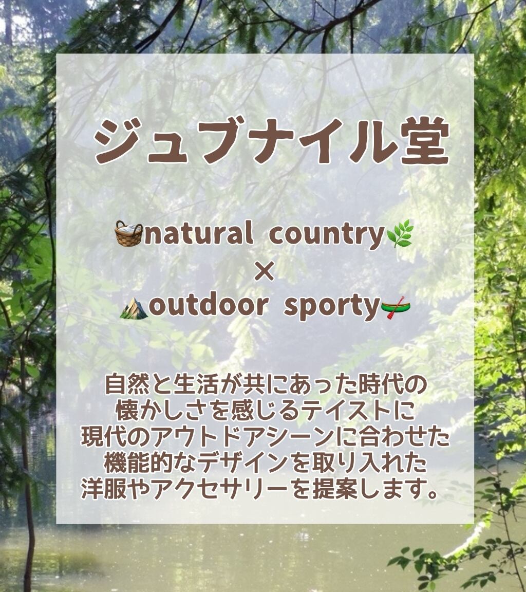 ナチュラル・カントリーとアウトドア・スポーティをテーマに、可愛らしさと着やすさを両立するファッションを提案します。
