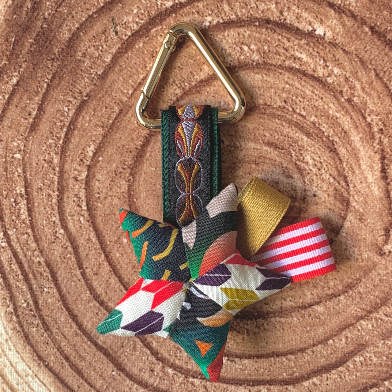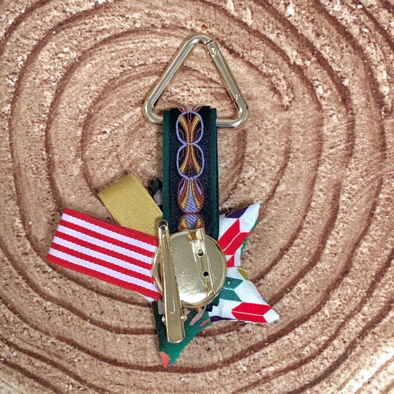 パッチワークのお星様をリボンで飾った流れ星のバッグチャームです。