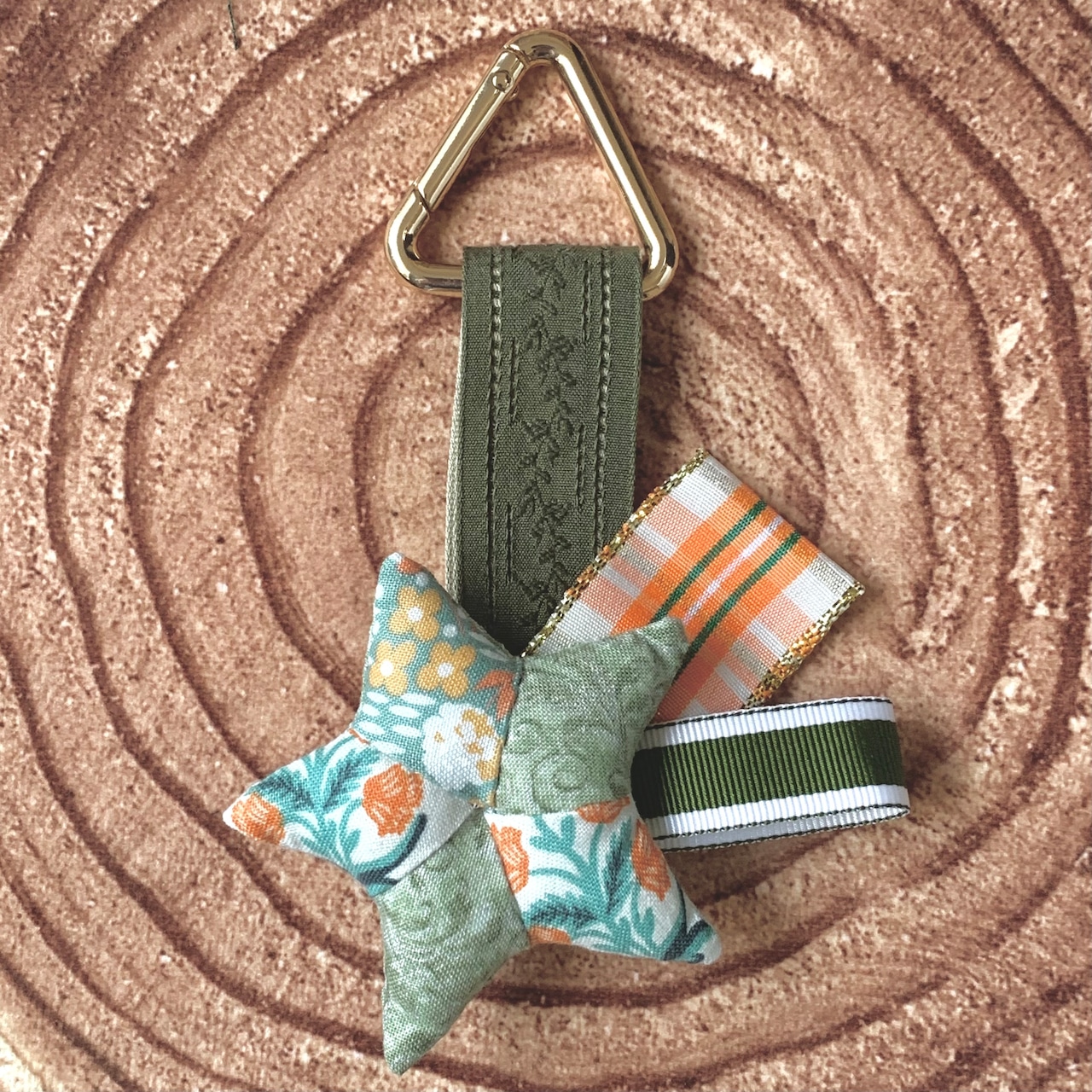 パッチワークのお星様をリボンで飾った流れ星のバッグチャームです。