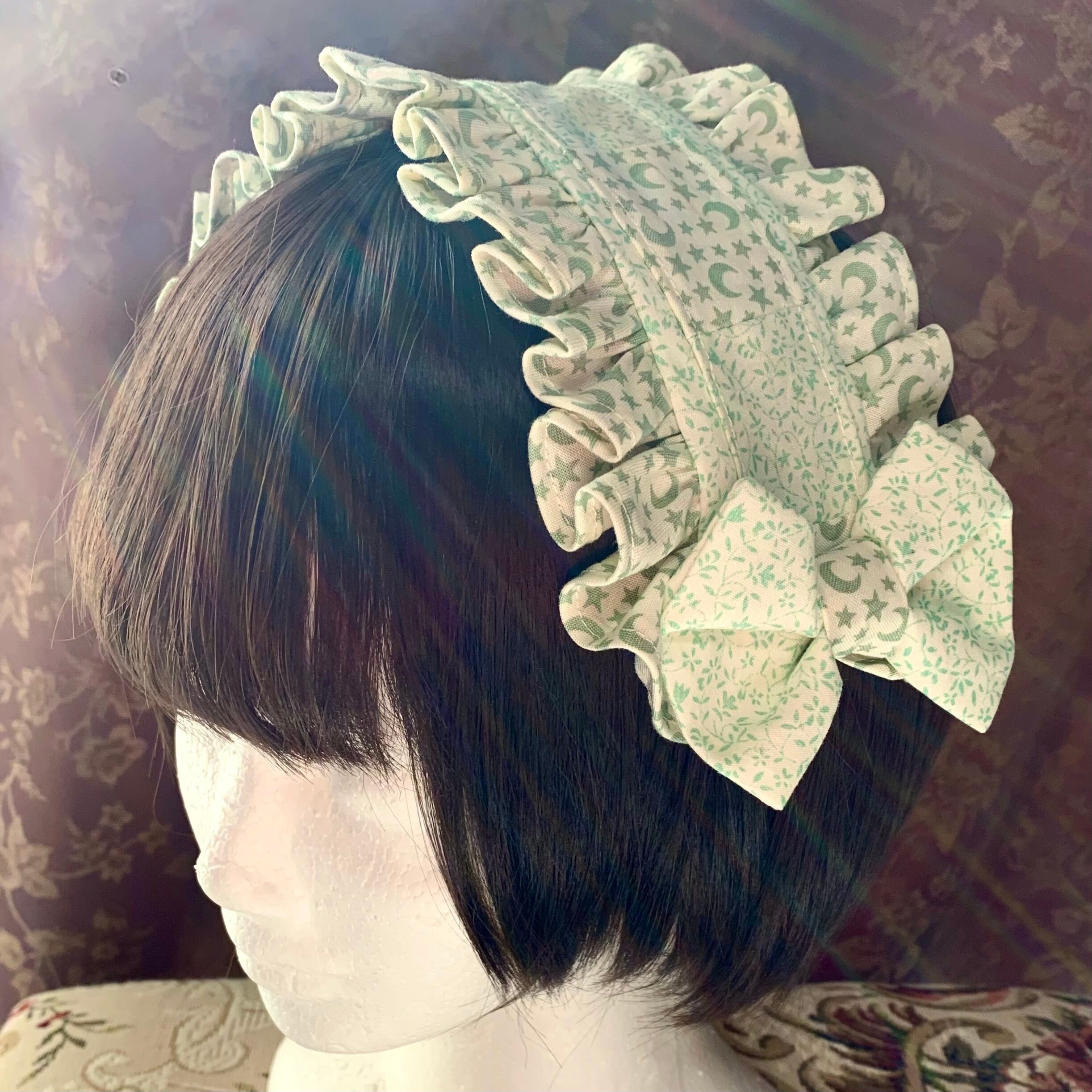 オフホワイトにミントカラーの小花柄と、月と星のドリーミーな生地を組み合わせました。