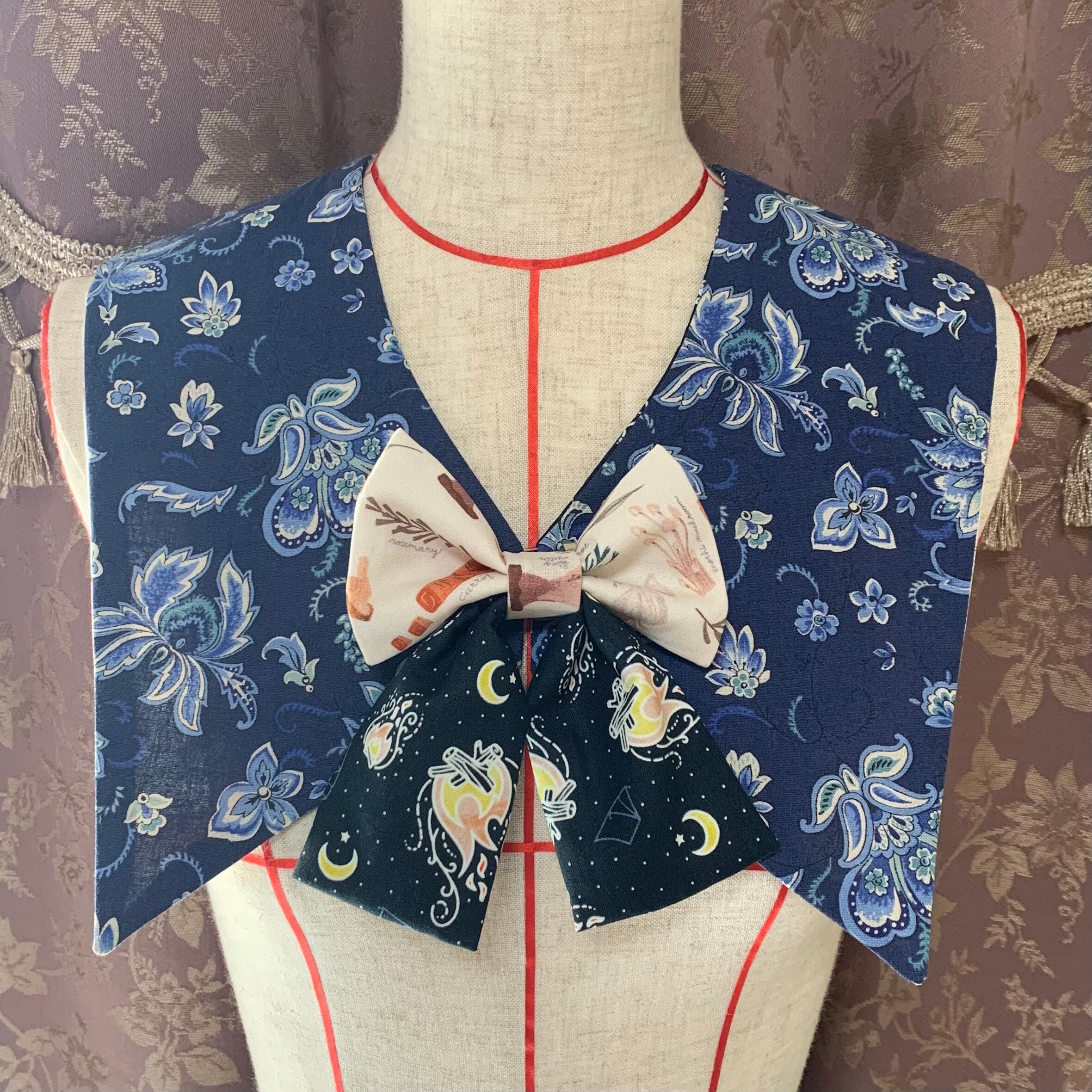 焚き火柄と野菜柄の生地を使用したトンガリつけ襟です。