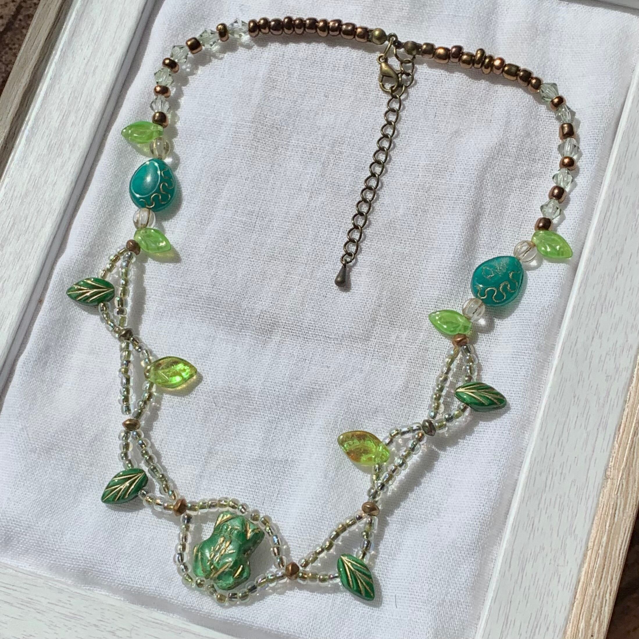 カエルの形のチェコビーズをメインに、朝露のような優しい輝きの玉虫色のビーズを組み合わせました。